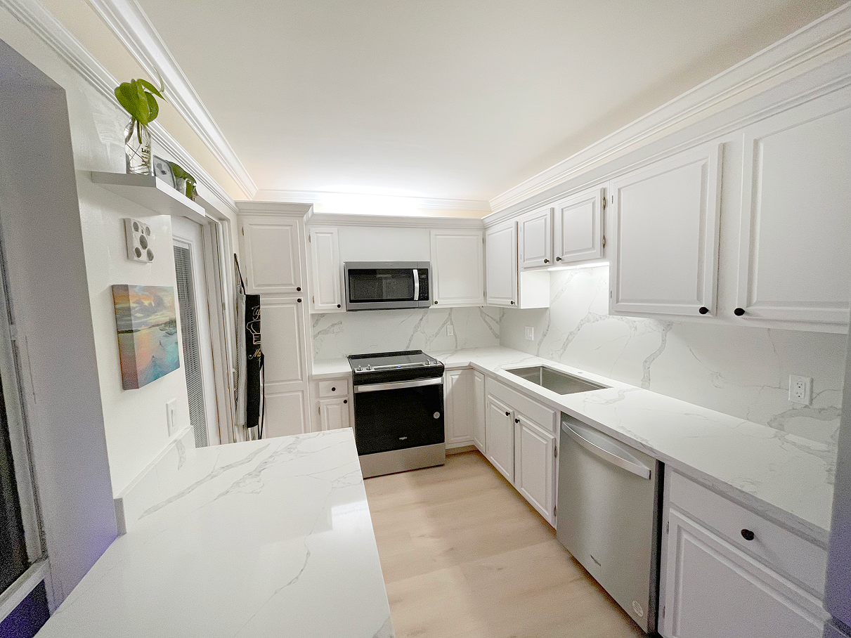 The result is a bright, sophisticated sanctuary that feels significantly larger than its original footprint. By removing the dark wood and replacing it with our signature white cabinetry and continuous quartz surfaces, we’ve turned a once-dull kitchen into a luminous centerpiece. The seamless flow of the stone from the countertop up the wall creates a high-end, custom-tailored feel that is a hallmark of Florida’s luxury remodeling standards. It is now a space that inspires culinary creativity and serves as a proud focal point for the home.