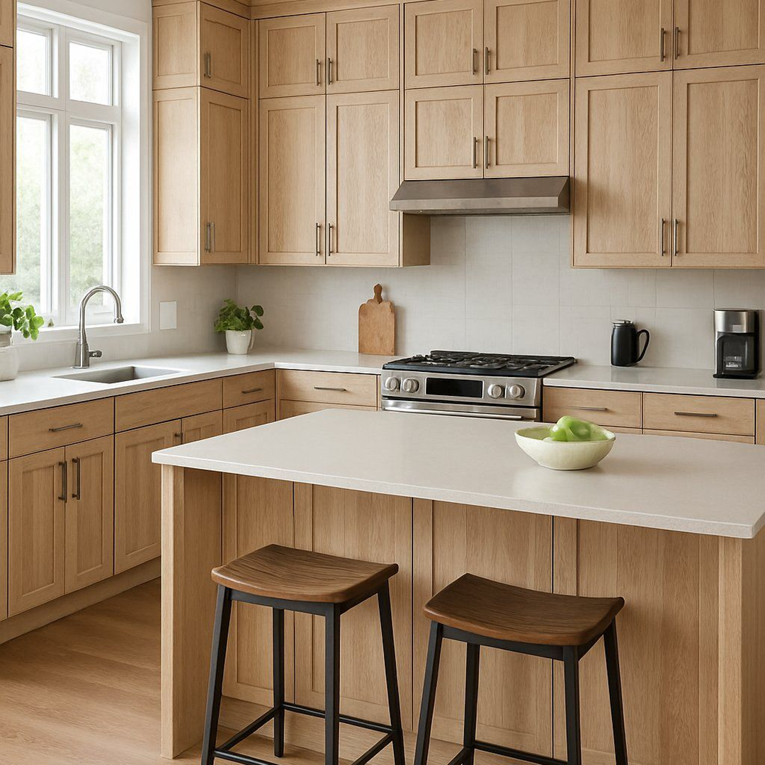 Designed for durability and everyday use, these cabinets pair beautifully with light quartz countertops, warm stone surfaces, and neutral finishes, making them a versatile choice for both kitchen remodeling and bathroom installations.