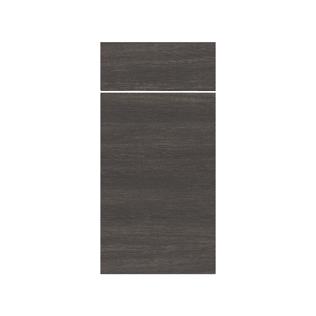 Textured dark brown wood-grain melamine with a horizontal grain pattern over engineered wood slab doors, with matching backs.